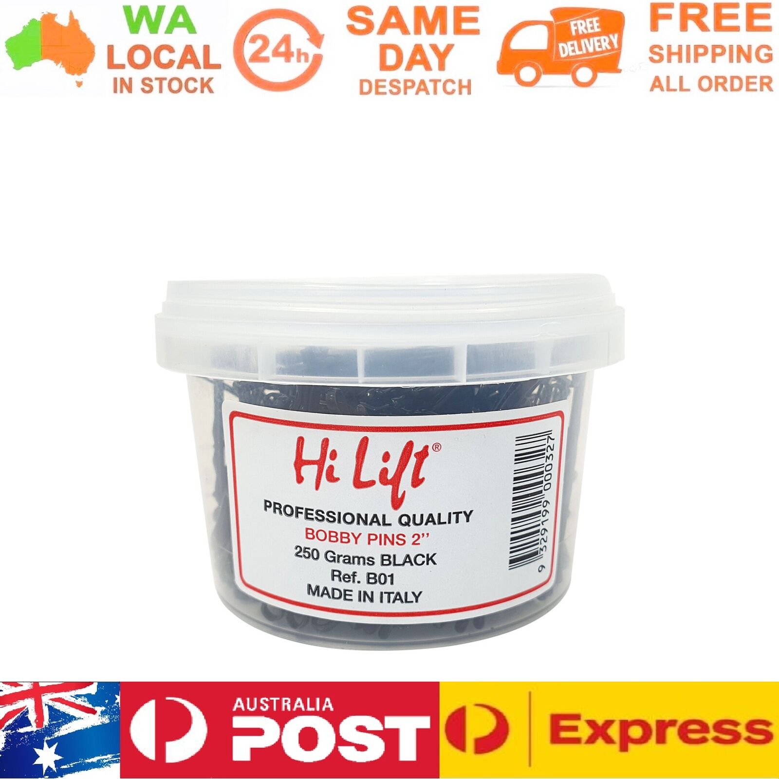 This tub contains 250 grams of 2 inch long bobby pins. Made in Italy.