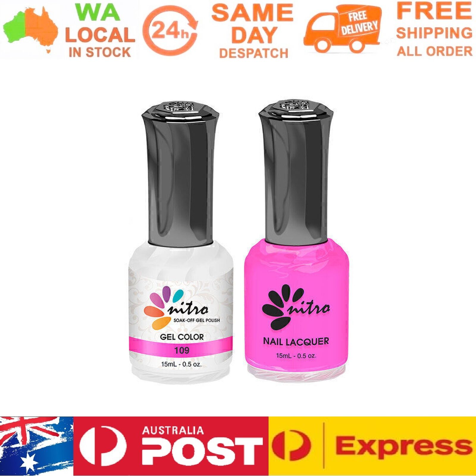 Instruction: Gently remove the shine from the nail bed with 180/240 buffer and clean the oil/dirt from the nail bed. Apply 1st thin layer of Nitro gel colour. Be sure to seal the free edge for each step. Cure under UV Lamp for 2 mins or LED for 60 seconds Apply 2nd layer Nitro gel colour. Cure under UV Lamp or LED lamp with the same time as step 3. Apply Nitro Top Gel. Cure under UV Lamp or LED with the same time as step 3. Use a lint-free pad/nail wipes with nail cleanser to remove the tacky residue on the nail. Packing Included: 1 x Gel Color 15ml 1 x Matching Nail Lacquer 15ml
