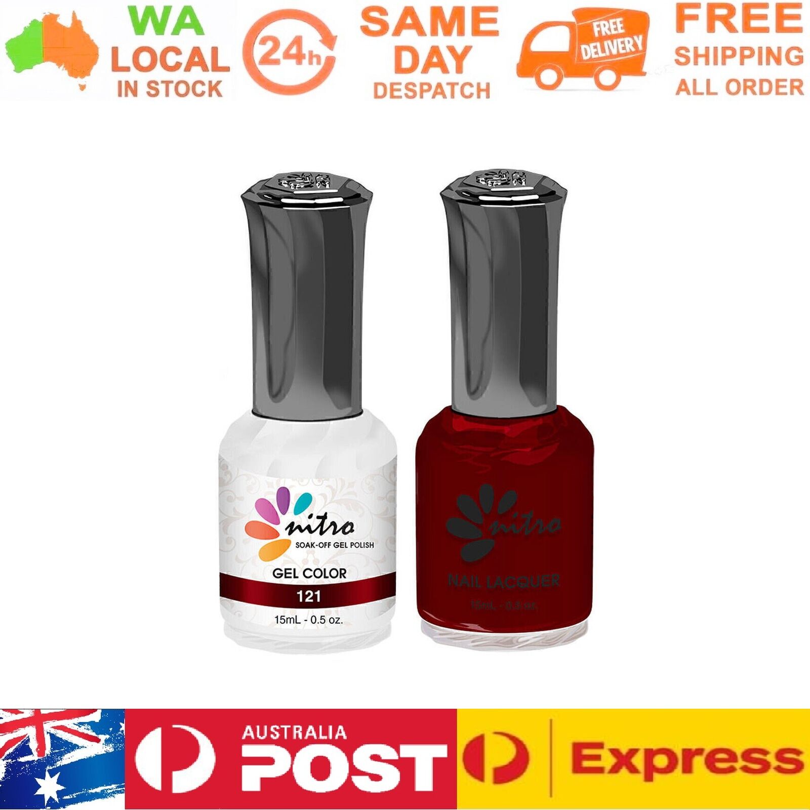 Instruction: Gently remove the shine from the nail bed with 180/240 buffer and clean the oil/dirt from the nail bed. Apply 1st thin layer of Nitro gel colour. Be sure to seal the free edge for each step. Cure under UV Lamp for 2 mins or LED for 60 seconds Apply 2nd layer Nitro gel colour. Cure under UV Lamp or LED lamp with the same time as step 3. Apply Nitro Top Gel. Cure under UV Lamp or LED with the same time as step 3. Use a lint-free pad/nail wipes with nail cleanser to remove the tacky residue on the nail. Packing Included: 1 x Gel Color 15ml 1 x Matching Nail Lacquer 15ml