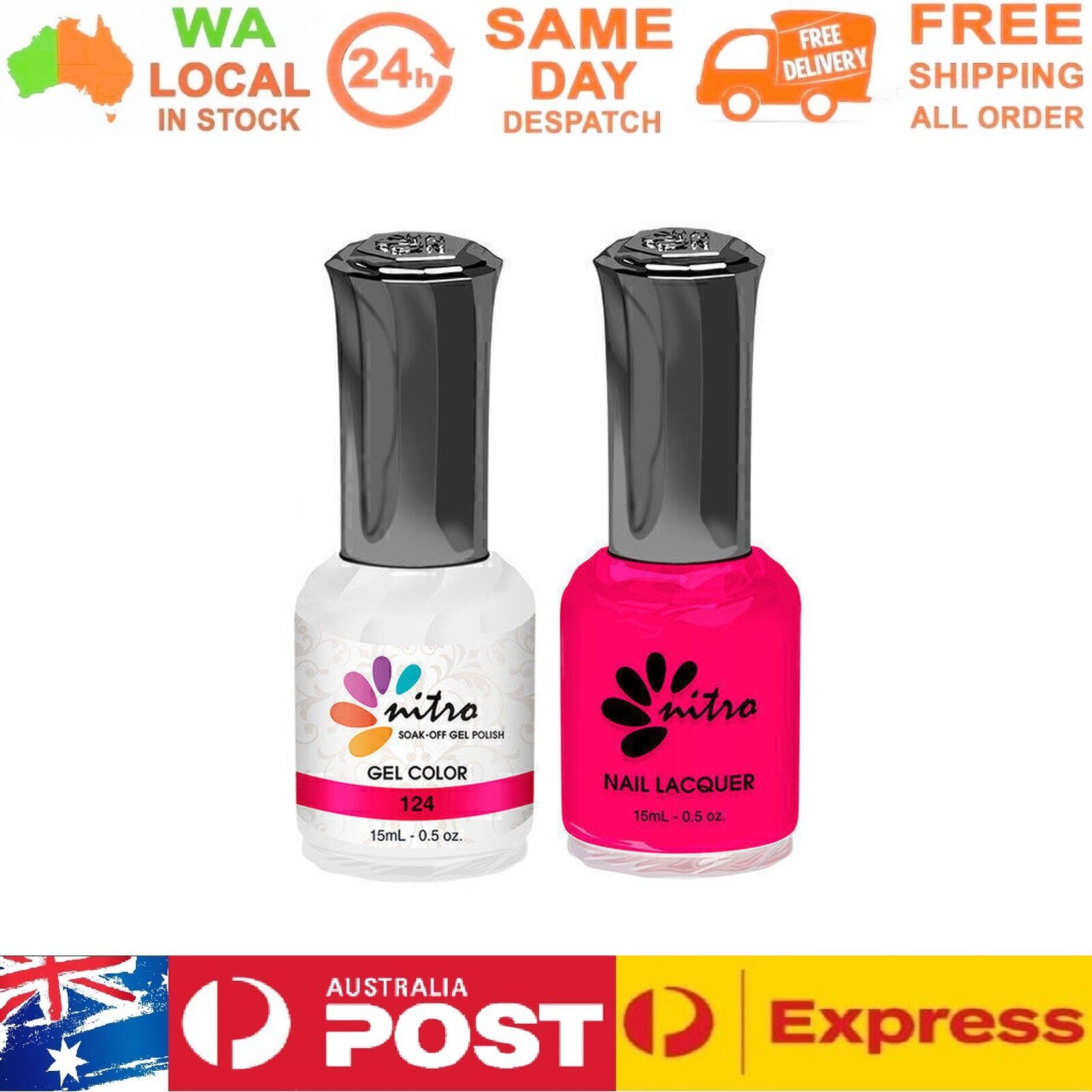 Instruction: Gently remove the shine from the nail bed with 180/240 buffer and clean the oil/dirt from the nail bed. Apply 1st thin layer of Nitro gel colour. Be sure to seal the free edge for each step. Cure under UV Lamp for 2 mins or LED for 60 seconds Apply 2nd layer Nitro gel colour. Cure under UV Lamp or LED lamp with the same time as step 3. Apply Nitro Top Gel. Cure under UV Lamp or LED with the same time as step 3. Use a lint-free pad/nail wipes with nail cleanser to remove the tacky residue on the nail. Packing Included: 1 x Gel Color 15ml 1 x Matching Nail Lacquer 15ml