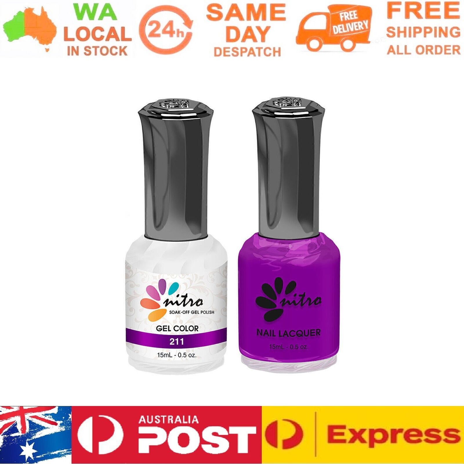 Instruction: Gently remove the shine from the nail bed with 180/240 buffer and clean the oil/dirt from the nail bed. Apply 1st thin layer of Nitro gel colour. Be sure to seal the free edge for each step. Cure under UV Lamp for 2 mins or LED for 60 seconds Apply 2nd layer Nitro gel colour. Cure under UV Lamp or LED lamp with the same time as step 3. Apply Nitro Top Gel. Cure under UV Lamp or LED with the same time as step 3. Use a lint-free pad/nail wipes with nail cleanser to remove the tacky residue on the nail. Packing Included: 1 x Gel Color 15ml 1 x Matching Nail Lacquer 15ml